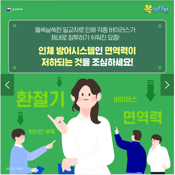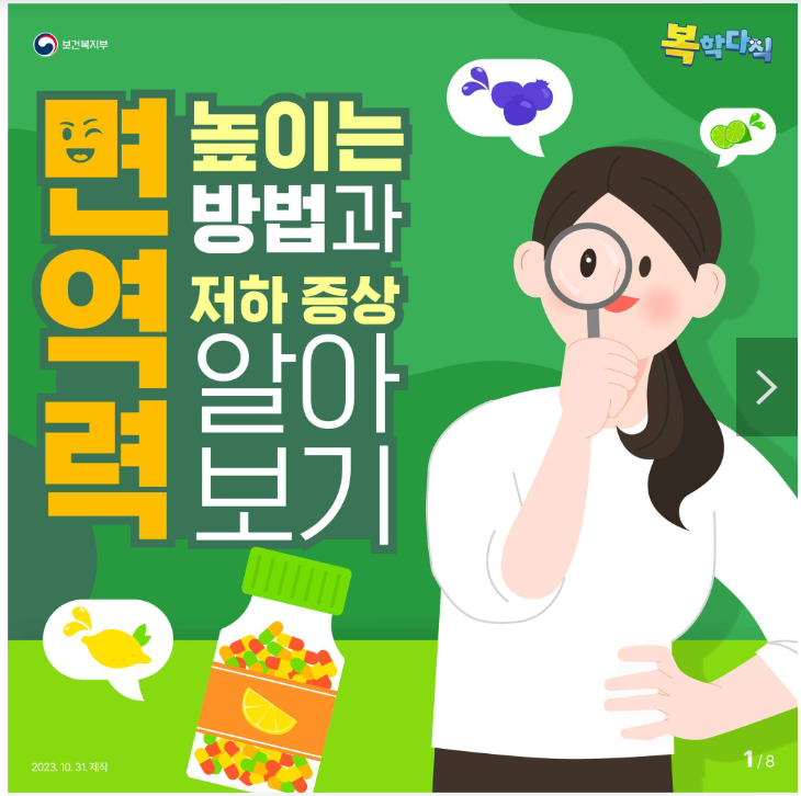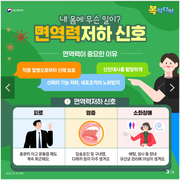 일교차가 큰 요즘 각종 바이러스 질환이 유행하고 있습니다. 이럴 때 가장 중요한 것은 우리 몸의 면역력을 높여주는 것입니다. 오늘은 면역력 높이는 방법 및 저하 증상에 대해 자세히 알아보겠습니다. 아래의 내용을 잘 숙지하시고 건강한 생활 하시기 바랍니다.