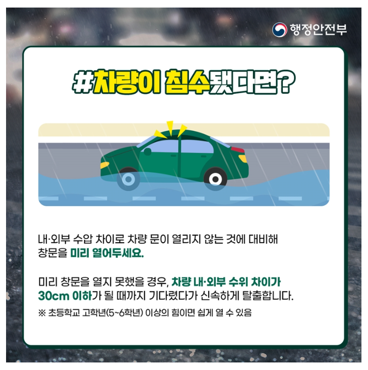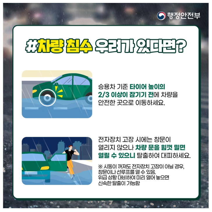 - 하천이나 해변, 저지대에 주차된 차량은 안전한 곳으로 이동합니다.