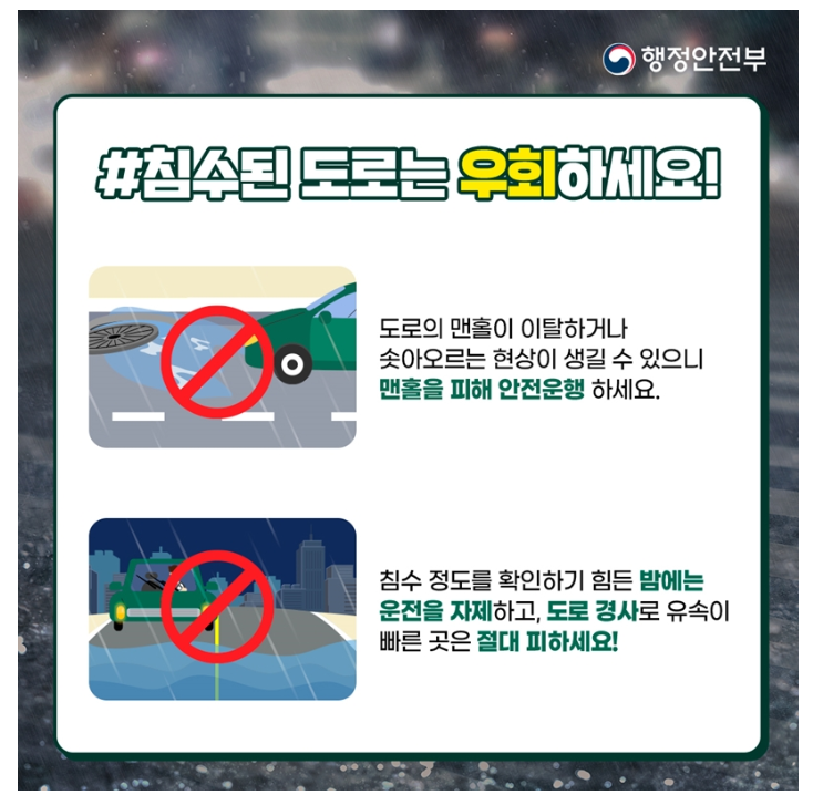 - 특히, 침수된 도록, 지하차도, 교량 등은 사람과 차량의 통행을 엄격히 금지하고 주변에 있는 사람들에게 알려 진입하지 않도록 합니다.