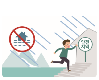 - 자주 물에 잠기는 지역, 산사태 위험지역 등의 위험한 곳은 피하고 안전한 곳으로 대피합니다.